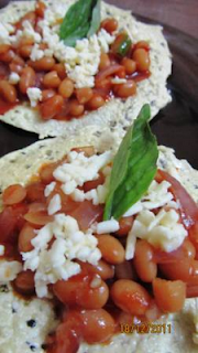 So this recipe is indo-mex :) papad meets refried beans ..tostada is basically a fried tortilla (mexican chappati made of corn /wheat flour) topped with all kinds of toppings - beans,corn,salsa,shrimp even.I had some left over baked beans and no bread at home so thought of this..you can add more garnishing with sour cream/salsa/lettuce/chopped tomatoes/olives...as you please or as your fridge is stocked !